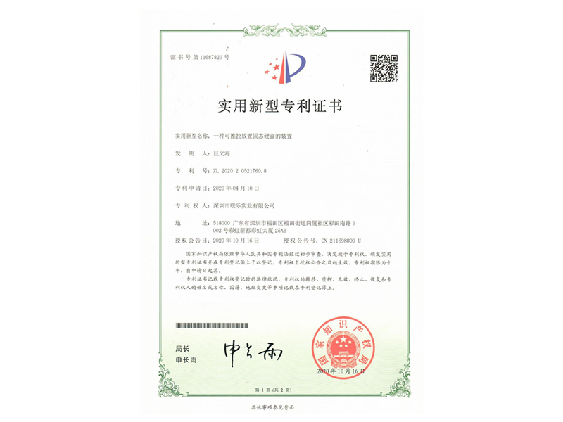實用新型專利證書-一種可推拉放置固態硬盤的裝置